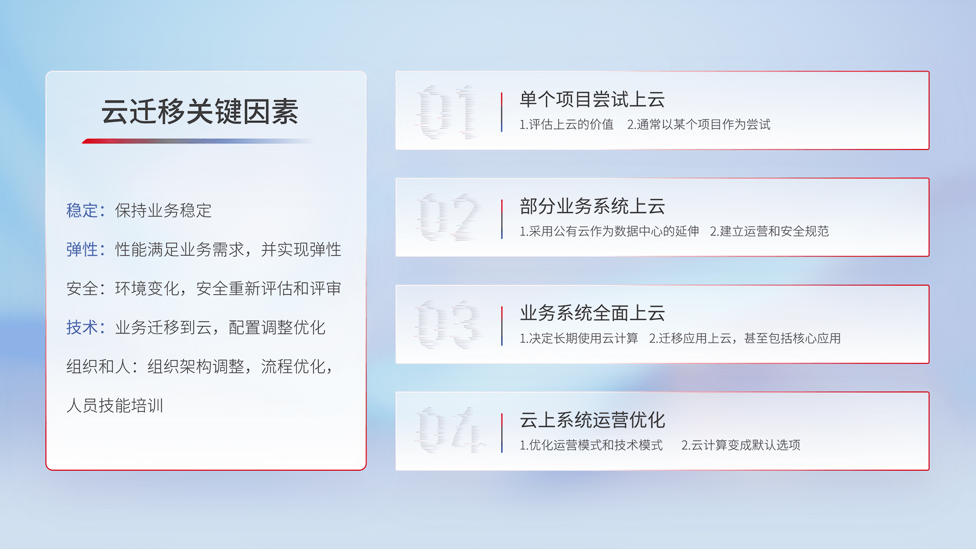 结合实际业务,,从规划设计、、云平台选型、、云原生改造、、数据迁移、、集成交付,,,,迁移全过程为客户识别最佳上云路径,,做好风险识别管理,,设计网络架构、、身份权限、、安全审计合规、、操作审计、、、、日志审计、、、、监控告警策略、、、多站点容灾设计等,,对云上基础设施进行整体规划,,提升IT治理水平,,,,以满足弹性、、、、高可用、、高性能的需求。。。