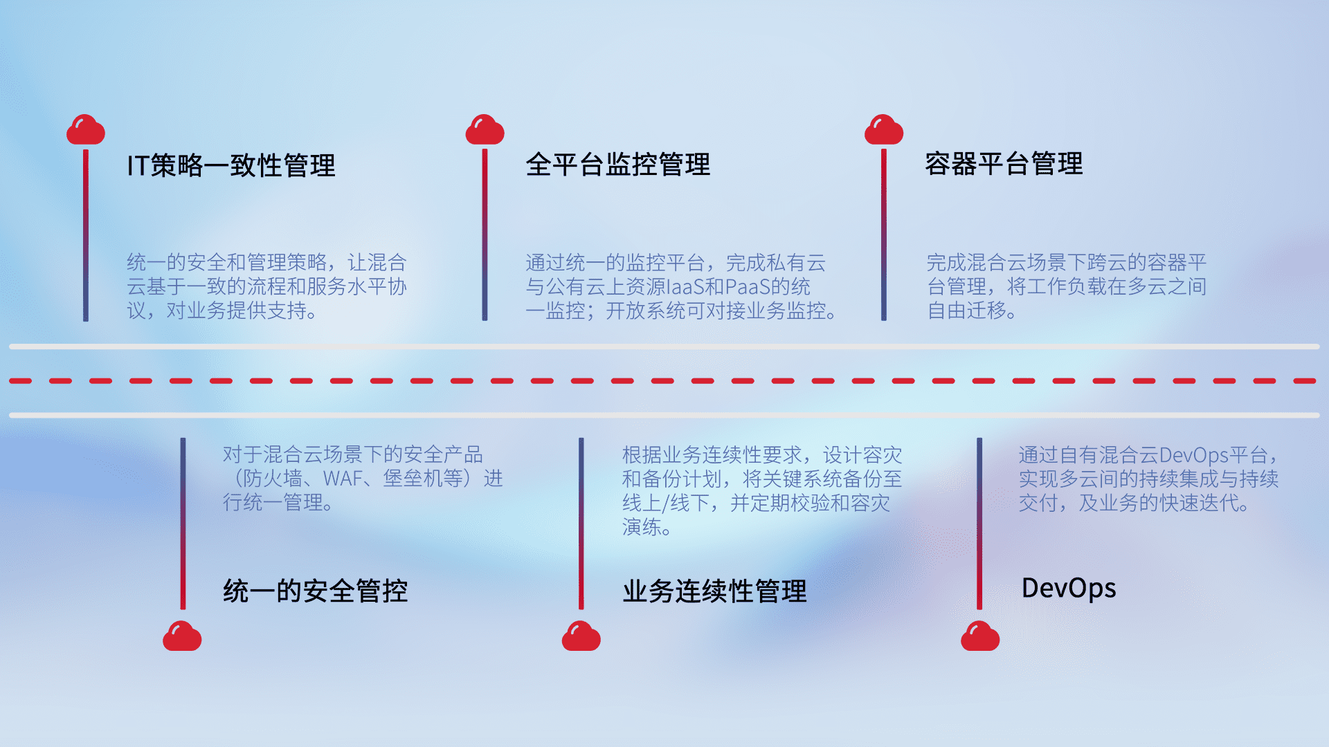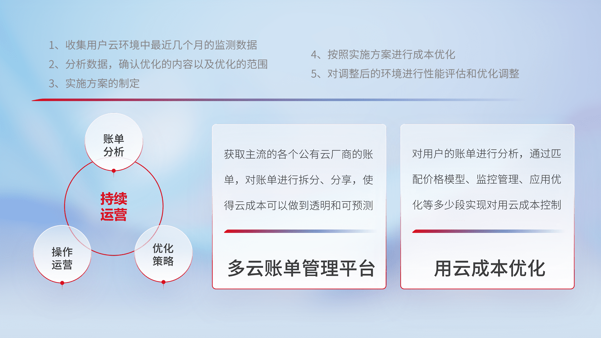 通过多云纳管,,,,以统一的资源数据模型把客户的云资源进行抽象和封装,,,进而实现对多云资源的统一操作,,保障云资源管理的可靠性、、稳定性与可用性。。。量身定制化运维内容,,配置、、开发运维、、、补丁管理、、、、备份、、、监控、、认证和访问管理、、、审计和日常巡检等,,保障在用云过程中的可靠度,,稳定度以及高可用率。。。
